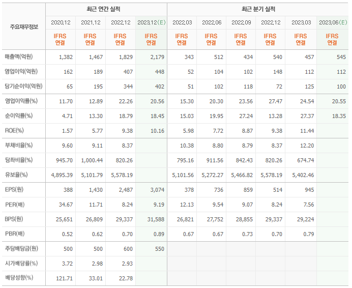 2022년 매출은 1829억, 영업이익은 407억, 당기순이익은 344억입니다. 그리고 영업이익률은 22.26%입니다.