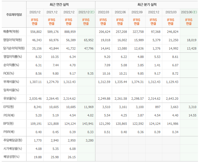2022년 실적은 88조 8959억, 영업이익은 5조 6389억입니다. 그리고 영업이익률은 6.34%입니다.