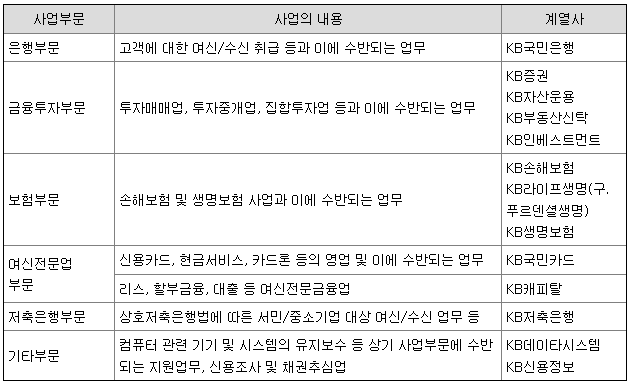 KB금융그룹은 국내 최대의 고객 기반을 바탕으로 은행업(KB국민은행), 금융투자업(KB증권, KB자산운용, KB부동산신탁, KB인베스트먼트), 보험업(KB손해보험, KB라이프생명(구.푸르덴셜생명), KB생명보험), 여신전문업(KB국민카드, KB캐피탈), 기타(KB저축은행, KB데이타시스템, KB신용정보) 등 금융의 전 영역에서의 선도적인 영업활동과 함께, 그룹 내 계열사간 시너지 창출을 통해 시장 지배력을 확대하고 있습니다.