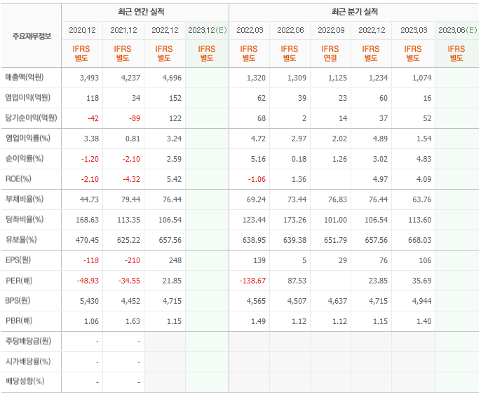 2022년 매출은 4696억, 영업이익은 152억, 당기순이익은 122억입니다. 그리고 영업이익률은 3.24%입니다.