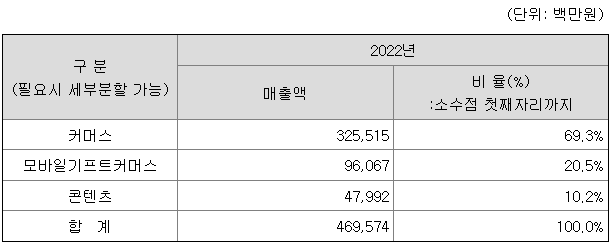 당사는 국내 최초로 데이터방송 T커머스 채널 'K 쇼핑'을 오픈하여 T커머스 시장을 선도하고 있으며 실물/가상 상품을 모바일로 교환할 수 있는 모바일 기프트(기프티쇼) 서비스를 제공하고 있습니다. 또한 IPTV, 스마트TV, 태블릿PC 등 스마트디바이스 기반을 중심으로 영화, 영상, 교육 등의 콘텐츠를 제공하고 있습니다.