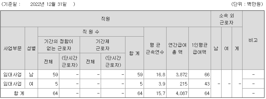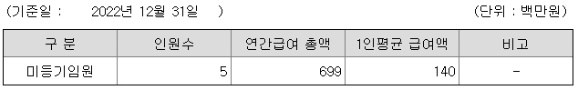 미등기임원의 평균연봉은 1억 4000만원이고 직원수는 5명입니다.