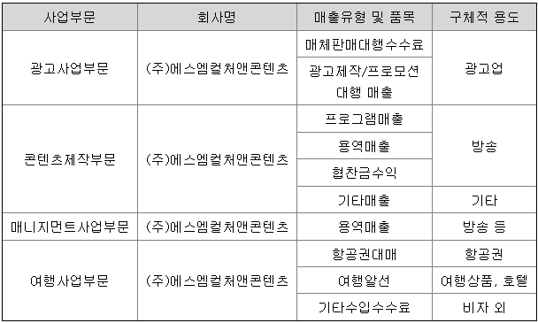 당사의 사업부문은 광고업, 영상 콘텐츠 제작사업, 매니지먼트 사업, 여행사업으로 구분됩니다.