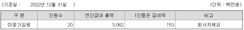 미등기임원의 평균연봉은 1억 5300만원이고 직원수는 20명입니다.