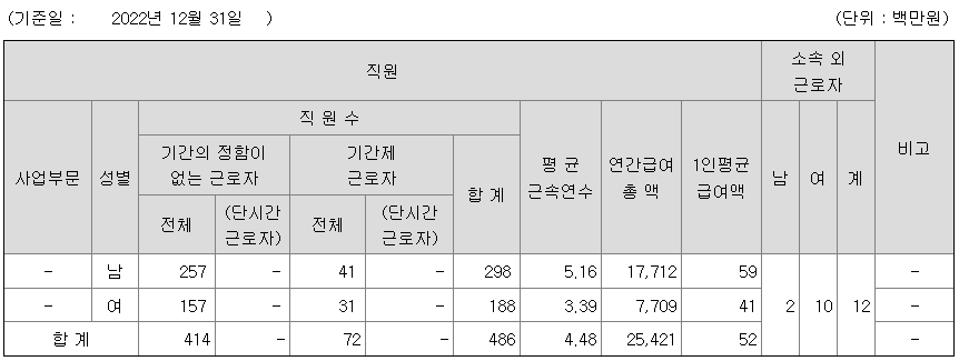 | 사업부문 | 성별 | 직원수 | 평균근속연수 | 평균연봉(백만) |