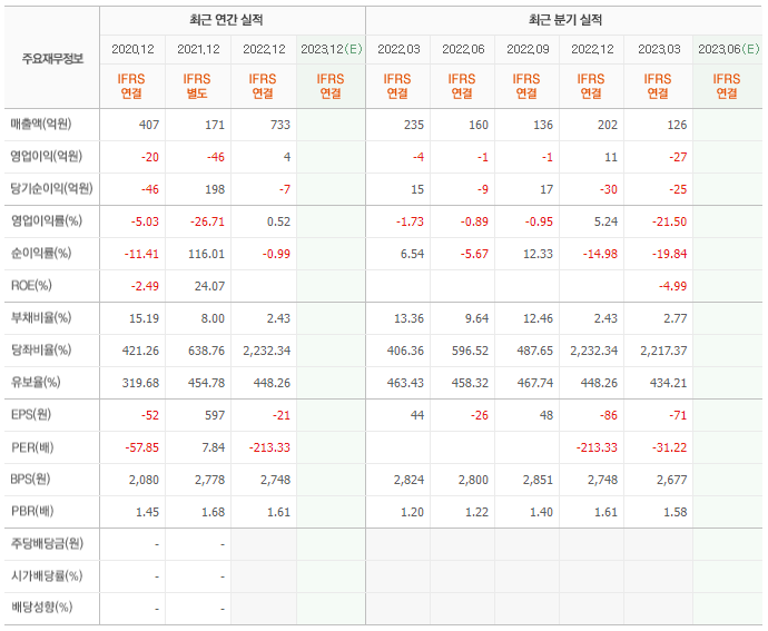 2022년 매출은 733억, 영업이익은 4억, 당기순이익은 -7억입니다. 그리고 영업이익률은 0.52%입니다.