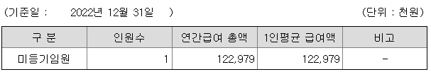 미등기임원의 평균연봉은 1억 2200만원이고 직원수는 1명입니다.