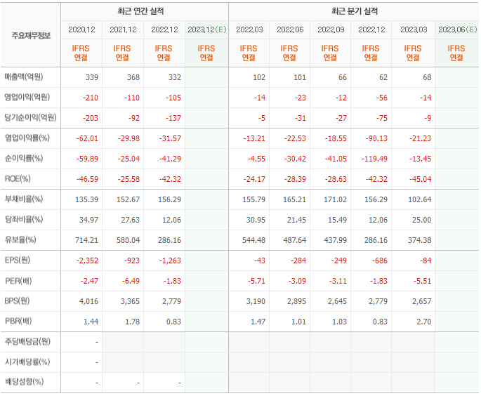 2022년 매출은 332억, 영업이익은 -105억, 당기순이익은 -137억입니다. 그리고 영업이익률은 -31.57%입니다.