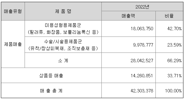 당사는 2007년 설립된 이후 생체재료인 히알루론산((Hyaluronic Acid), 콜라겐(Collagen)을 가공하여 의료기기, 의약품, 코스메슈티컬(Cosmeceutical) 제품 등 차세대 바이오 시장을 선도할 전략적 응용제품의 연구, 개발 및 진단시약 및 시험기기 유통업을 영위하고 있습니다.