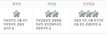 - 경무관 : 지방청 차장, 서울·경기지방청 부장, 경찰청 심의관 급입니다.