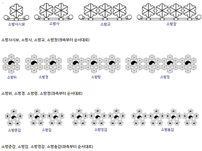 - 소방사·소방교·소방장 : 소방사는 육각수 2개, 소방교는 육각수 3개, 소방장은 육각수 4개입니다.