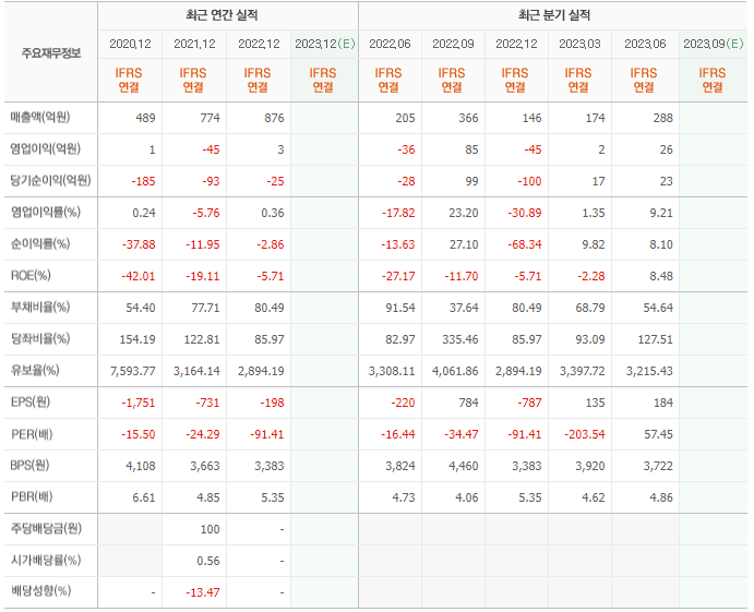 2022년 매출은 876억, 영업이익은 3억, 당기순이익은 -25억입니다. 그리고 영업이익률은 0.36%입니다.