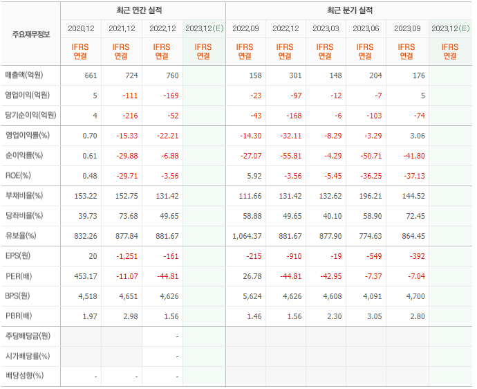 2022년 매출은 760억, 영업이익은 -169억, 당기순이익은 -52억입니다. 그리고 영업이익률은 -22.21%입니다.