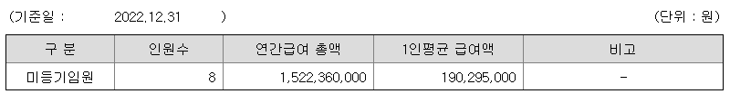 미등기임원의 평균연봉은 1억 9029만원이고 직원수는 8명입니다.