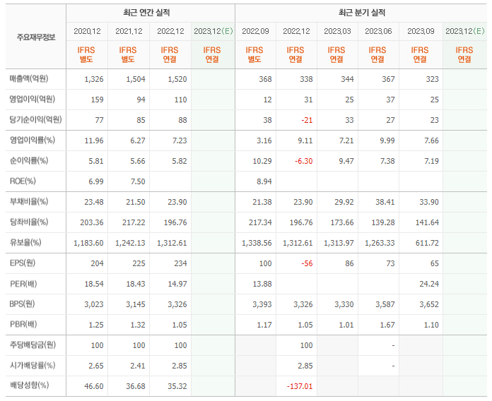 2022년 매출은 1520억, 영업이익은 110억, 당기순이익은 88억입니다. 그리고 영업이익률은 7.23%입니다.