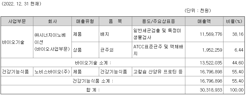 당사는 미생물배양배지 제조 및 판매 사업을 영위하고 있으며, 2020년 코로나19 팬데믹에 대응하여 바이러스 수송배지를 개발하여 판매하고 있습니다. 그 밖에 자회사 노비스바이오(주)를 통해 건강기능식품 사업 등을 영위하고 있습니다. 스텐트 등 의료기기 제조, 판매 사업을 영위하고 있는 (주)엠아이텍은 주식양수도계약 체결로 인해 중단영업으로 분류하였습니다. 주요 사업내용은 아래와 같습니다.