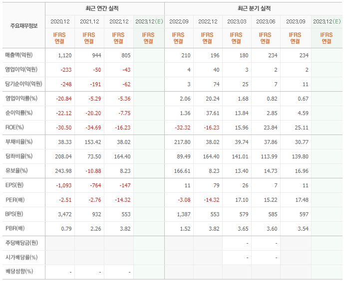 2022년 매출은 805억, 영업이익은 -43억, 당기순이익은 -62억입니다. 그리고 영업이익률은 -5.36%입니다.