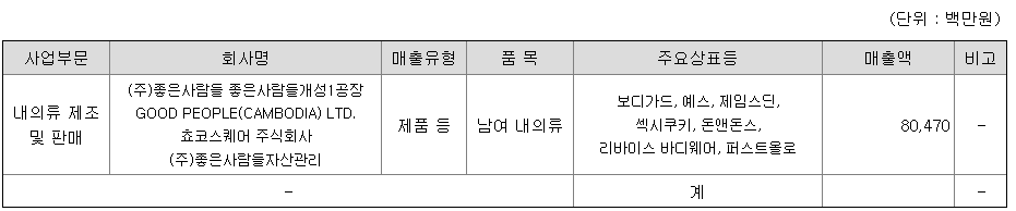 당사는 내의류 제품을 주로 제조, 판매하고 있습니다. 제품은 브랜드별 아이템으로 구분되나 구체적 용도에 따른 분류를 하기는 어렵습니다.