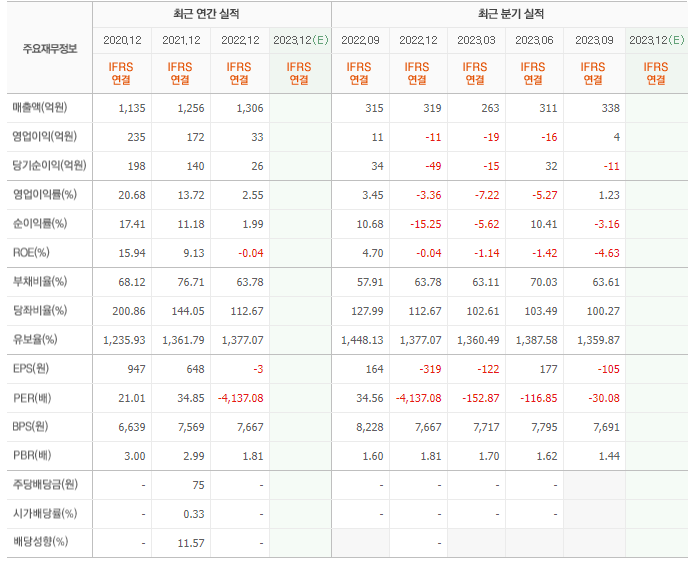 2022년 매출은 1306억, 영업이익은 33억, 당기순이익은 26억입니다. 그리고 영업이익률은 2.55%입니다.