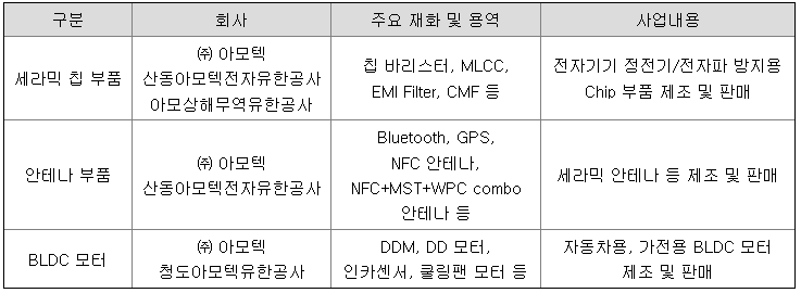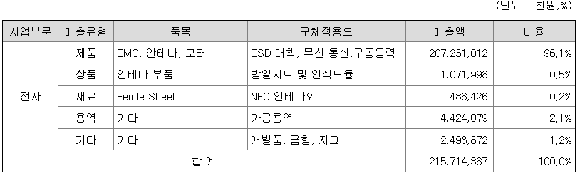 당사는 수익을 창출하는 재화와 용역의 성격, 제품 및 제조공정의 특징, 시장 및 판매방법 등을 고려하여 경영 현황을 적절히 반영할 수 있도록 세라믹 칩 부품 부문, 안테나 부품 부문 및 BLDC 모터 부문 총 3개의 사업부문으로 구분하고 있습니다.