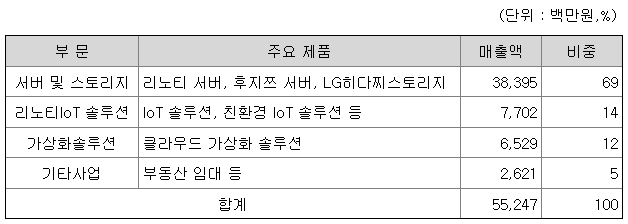 당사가 영위하는 사업 부문별 주요 제품으로는 리노티 서버, 후지쯔 서버, LG히다찌스토리지, IoT 솔루션, 클라우드 가상화 솔루션이 있습니다. 제품에 관한 사항은 "2. 주요 제품 및 서비스"의 "가. 주요 제품의 현황"의 항목을 참고하시기 바랍니다.