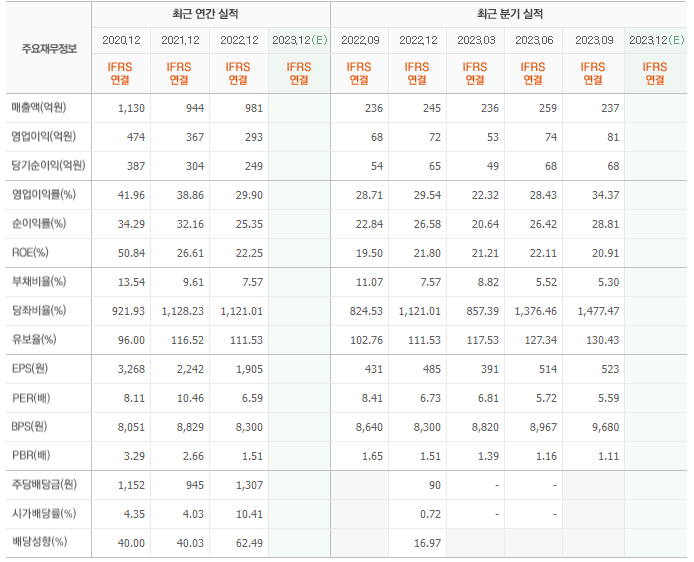 2022년 매출은 981억, 영업이익은 293억, 당기순이익은 249억입니다. 그리고 영업이익률은 29.90%입니다.