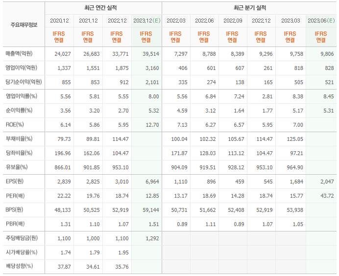 2022년 실적은 3조 3771억, 영업이익은 1875억입니다. 그리고 영업이익률은 5.55%입니다.