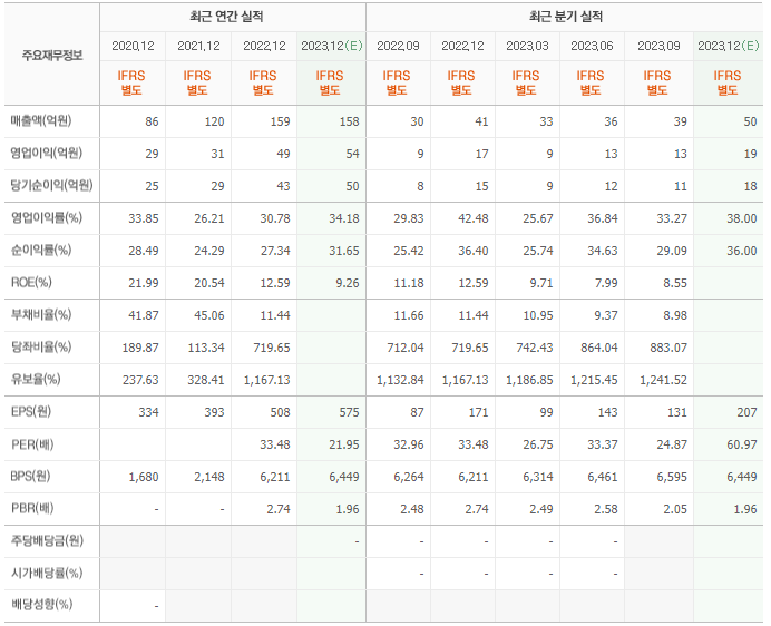 2022년 매출은 159억, 영업이익은 49억, 당기순이익은 43억입니다. 그리고 영업이익률은 30.78%입니다.