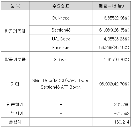 민항기 제조 부문은 민항기에 들어가는 부품, 구조물 및 동체를 생산하는 사업부문으로 당기 매출은 전년 동기 대비 97.4% 성장한 1,602억원을 달성하였습니다.