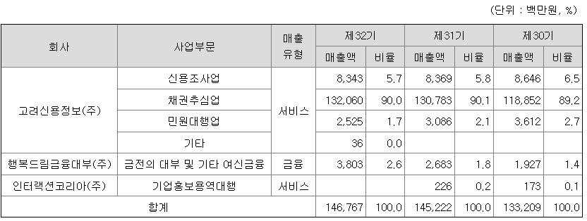 당사는 채권추심업, 신용조사업, 민원대행업을 영위하고 있으며, 신용정보협회 기준 국내 채권추심 업계 1위를 12년 연속 유지하고 있습니다. 2022년 업종별 매출 비중은 채권추심업 92.4%, 신용조사업 5.8%, 민원대행업 1.8%이며, 채권추심업은 전체 매출액의 90% 이상을 차지하는 주력 사업부문입니다. 당사의 채권추심 사업부문은 수임되는 연체채권에 따라 크게 상사채권 및 민사채권, 금융채권, 통신채권 및 렌털채권 등으로 분류하고 있습니다.
