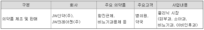 클리닉 시장을 선도하는 제품을 바탕으로 JW중외제약(주)의 오리지널 의약품에 대한공동마케팅을 통해 체계적인 영업네트워크를 구축하고 있습니다.