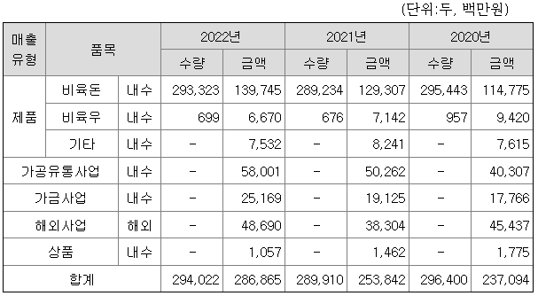 당사는 수직계열화된 육돈전문회사로서 양돈의 생산, 사육, 판매 및 축산물종합처리장(LPC)을 통한 축산물 가공유통사업을 영위하는 회사입니다. 회사는 2005년 양돈업을 시작하여 현재 직영농장 22개와 위탁농장을 운영하고 있으며, 2015년말 강원엘피씨를 합병하여 부분육 브랜드시장에 진출할 수 있는 기반을 완성하였습니다. 우수한 품질의 원종돈을 보유하여 2022년 기준 MSY 23.1두의 높은 생산성(MSY-모돈 두당 1년간 비육돈 출하두수)과 1등급비율 76.6%의 고품질 양돈을 생산하고 있으며, 사육부터 유통단계까지의 전 과정에 대한 HACCP 인증을 받아 계속해서 유지해가며 소비자들에게 보다 위생적이고 안전한 고품질 돈육을 제공하고 있습니다.
