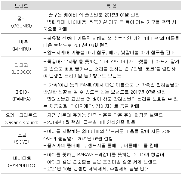 당사는 꿈비(GGUMBI), 리코코(LICOCO), 오가닉그라운드(Organic ground), 미미루(MIMIRU), 파미야(FAMIYA) 등의 브랜드를 런칭하여 놀이방 매트 뿐만 아니라 유아용 침구류 및 가구, 스킨케어, 세제, 반려동물용품 등을 개발 및 판매하고 있습니다. 당사가 운영 중인 주요 브랜드 현황은 다음과 같습니다.