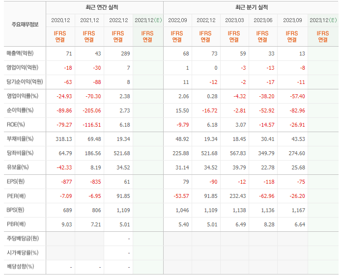 2022년 매출은 289억, 영업이익은 7억, 당기순이익은 8억입니다. 그리고 영업이익률은 2.38%입니다.