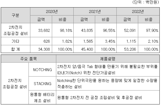 당사는 이차전지 생산 자동화 설비의 제조를 주력 사업으로 영위하고 있습니다. 2006년 당시 일본회사 제품에 의존하던 노칭 장비의 국산화에 성공하여 국내 대기업에 이차전지 자동화 설비를 납품하기 시작하였습니다. 당사는 국내 이차전지 자동화 설비 분야의 '1세대’업체라고 할 수 있으며, 창사 이래 1만개 가량의 크고 작은 이차전지 자동화 설비제작 프로젝트를 진행하며 기술력을 쌓아왔습니다.