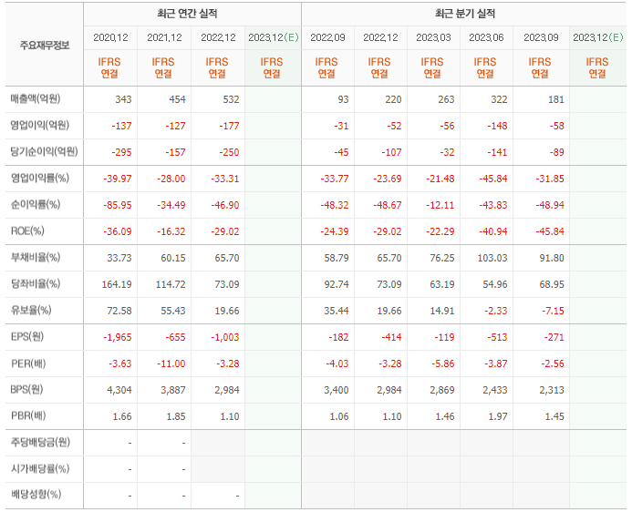 2022년 매출은 532억, 영업이익은 -177억, 당기순이익은 -250억입니다. 그리고 영업이익률은 -33.31%입니다.