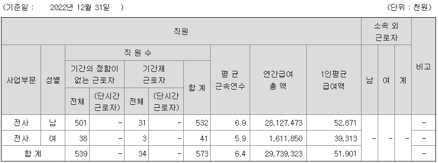 남성의 평균연봉은 5287만원이고 직원수는 532명, 여성은 3931만원이고 직원수는 41명입니다. 전체 평균연봉은 5190만원이고 직원수는 573명입니다.