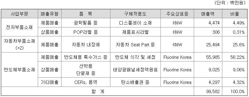 당사 및 종속회사의 사업은 전자부품소재 사업부문(점착 코팅 소재 등)과 자동차부품소재 사업부문(자동차용 내장재 등), 반도체소재 사업부문(F2, SF6 가스 등)으로 구성되어 있으며, 경기도 파주, 울산광역시, 중국 및 베트남에 생산시설을 보유하고 있습니다.