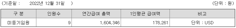 미등기임원의 평균연봉은 1억 7826만원이고 직원수는 9명입니다.