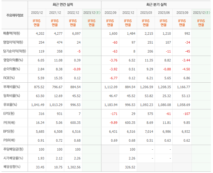 2022년 매출은 6097억, 영업이익은 24억, 당기순이익은 -5억입니다. 그리고 영업이익률은 0.39%입니다.