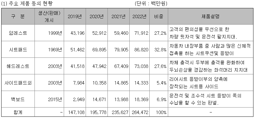 당사는 한국표준산업분류상 '자동차용 신품 의자 제조업(C30393)'에 속하는 회사로서 자동차부품 중 내장재(시트류) 제조를 사업목적으로 설립되어 자동차 시트쿠션 및 등받이(시트패드), 좌석 팔 지지대(암레스트), 좌석 머리 지지대(헤드레스트), 좌석 등받이부의 사이드(사이드패드) 등 시트류 부품을 제조하고 있습니다.