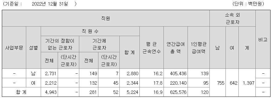 | 사업부문 | 성별 | 직원수 | 평균근속연수 | 평균연봉(백만) |