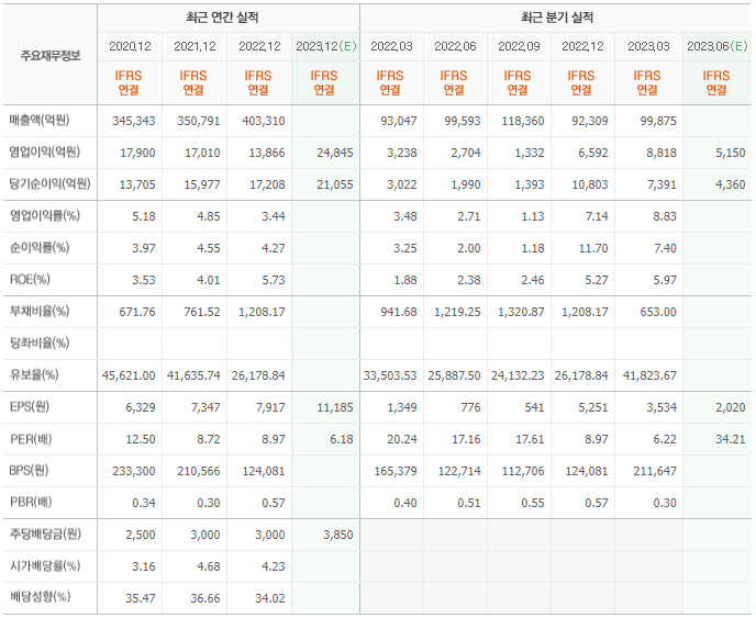2022년 실적은 40조 3310억, 영업이익은 1조 3866억입니다. 그리고 영업이익률은 3.44%입니다.