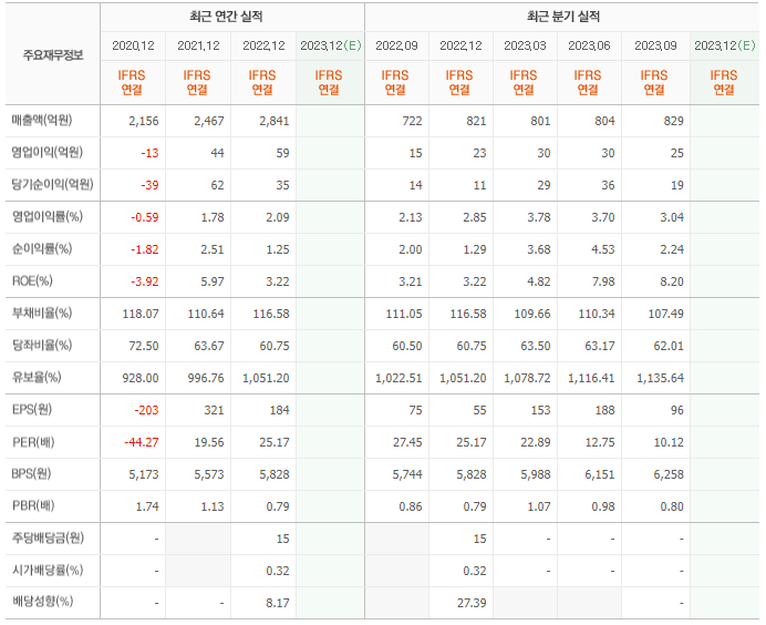 2022년 매출은 2841억, 영업이익은 59억, 당기순이익은 35억입니다. 그리고 영업이익률은 2.09%입니다.
