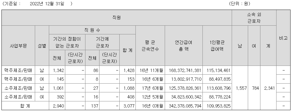 | 맥주제조/판매 | 남 | 1,428 | 16년 11개월 | 115 |