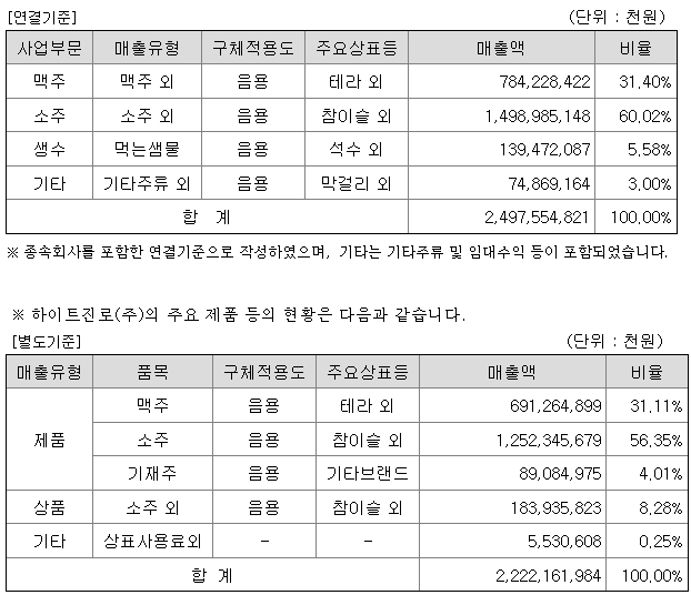 2022년 사회적 거리두기는 해제됐으나 물가상승 및 소비심리 악화 등으로 인해 유흥 시장 회복이 더딘 상황이며 비중이 증가한 가정 시장을 중심으로 다수의 수제맥주 출시 등 소비자 선택의 폭이 확대되며 맥주 시장 경쟁은 더욱 치열해진 상황입니다. 당사는 이러한 시장 변화 및 소비 트렌드에 대응하기 위해 가성비 혜택을 제공할 수 있는 400ML/463ML 캔, 1.9L페트를 출시하여 가정 시장에서 성공적인 성과를 기록하고 있습니다. 2019년 3월 출시한 청정라거 테라는 2022년 11월 테라 SINGLE MALT 에디션을 출시하며 2022년 12월 기준 34억병 판매를 돌파하였습니다.