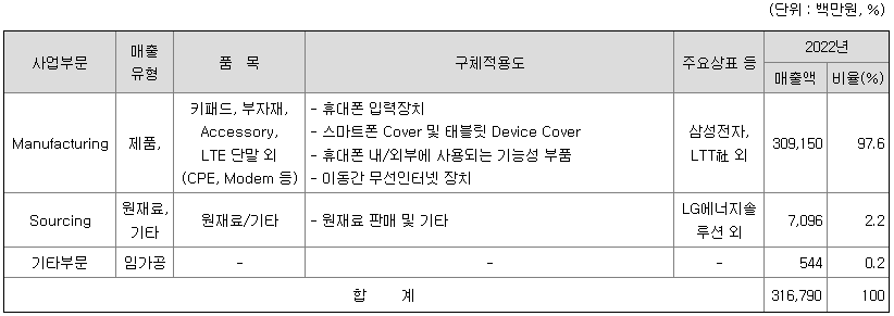 당사는 이동통신용 휴대폰 키패드, 부자재, Flip-cover, Book-cover 및 Silicone-cover, CPE, Mobile Router의 4G/5G 모듈 및 단말기, SCM, PCM, Cap Lamp등의 2차 전지 보호회로 제품을 삼성전자 및 LG에너지솔루션 등 국내외 이동통신사업자 등에 생산, 공급하고 있습니다.