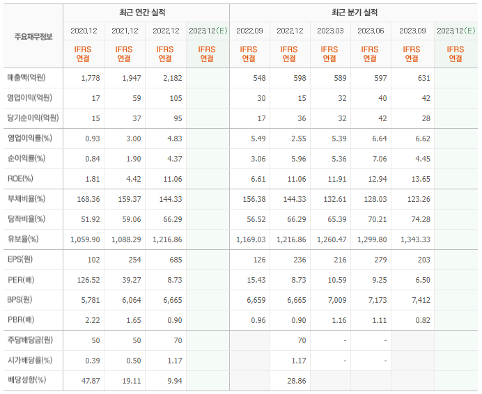 2022년 매출은 2182억, 영업이익은 105억, 당기순이익은 95억입니다. 그리고 영업이익률은 4.83%입니다.