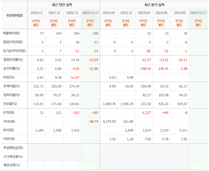 2022년 매출은 254억, 영업이익은 36억, 당기순이익은 -11억입니다. 그리고 영업이익률은 14.10%입니다.