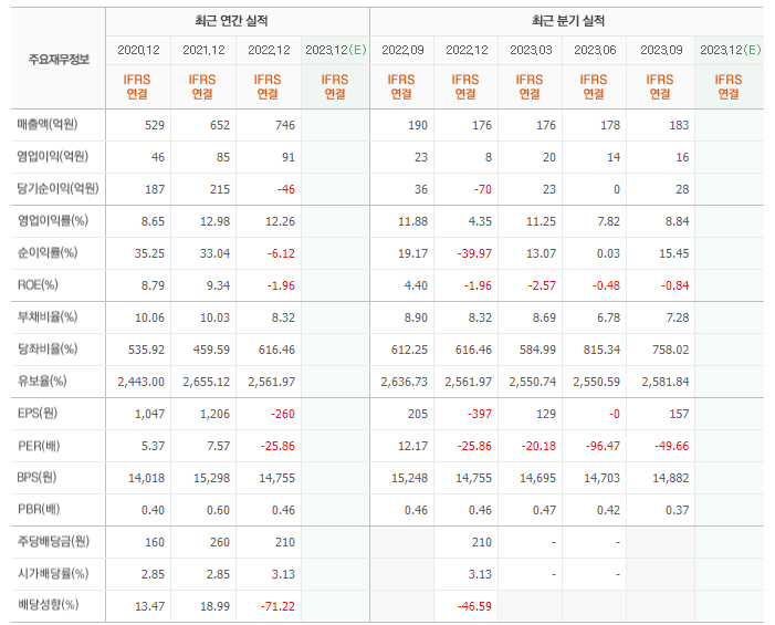2022년 매출은 746억, 영업이익은 91억, 당기순이익은 -46억입니다. 그리고 영업이익률은 12.26%입니다.